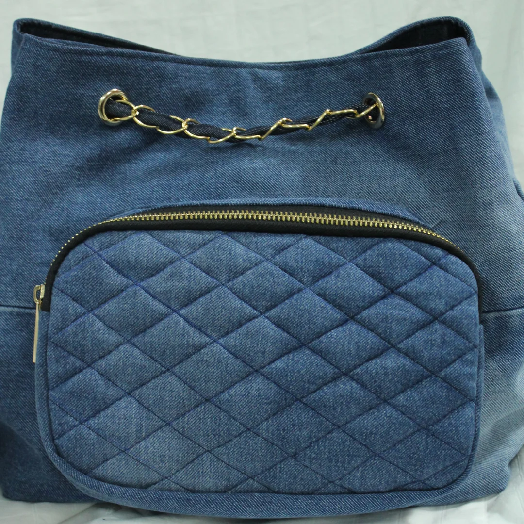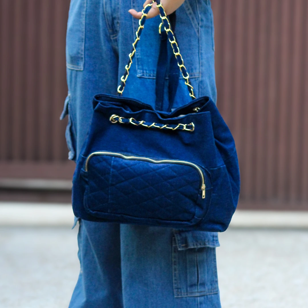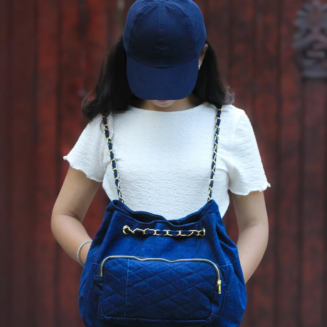 This quilted drawstring denim bag offers a blend of style and functionality, perfect for daily use or as a statement piece for casual outings.