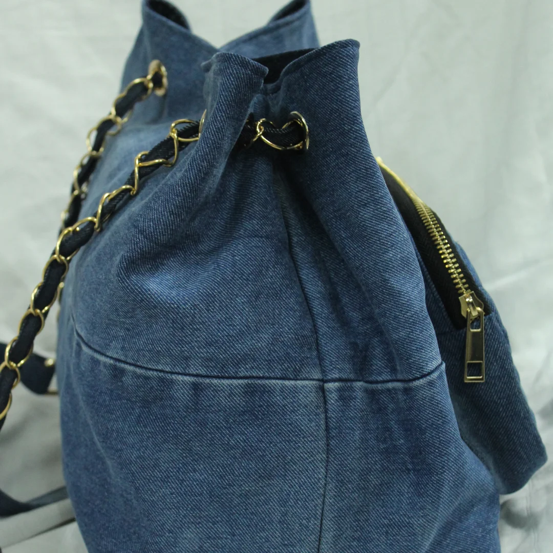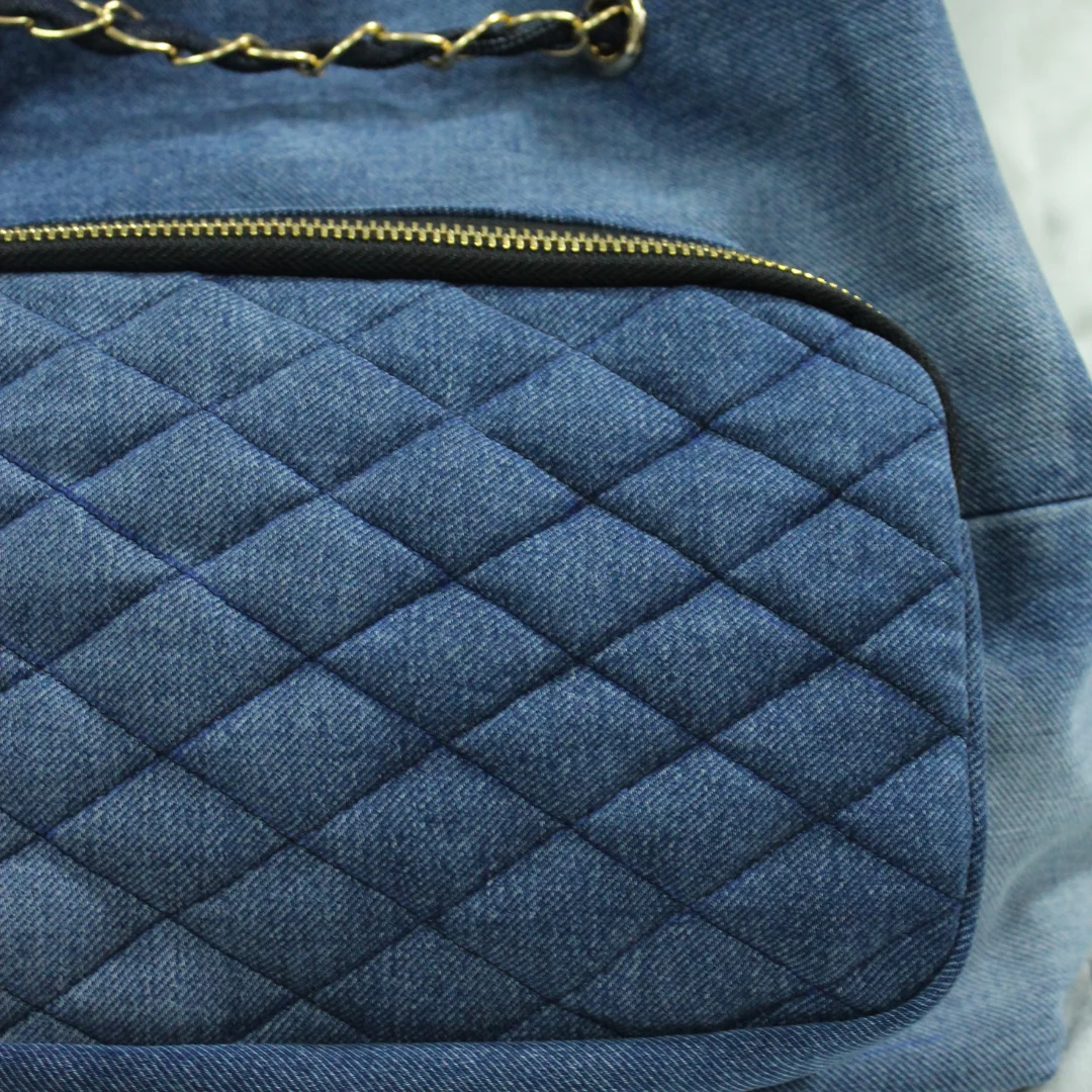 The bag features a drawstring closure for quick access and added security, and comes with adjustable chain and denim shoulder straps for versatile carrying. The exterior quilting provides a unique texture, while an additional front zipper pocket offers extra storage.